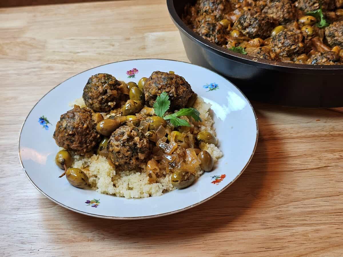 שמים קוסקוס בצלחת, מוסיפים מעל כדורי בשר ורוטב, בוזקים כוסברה קצוצה או פטרוזילה.