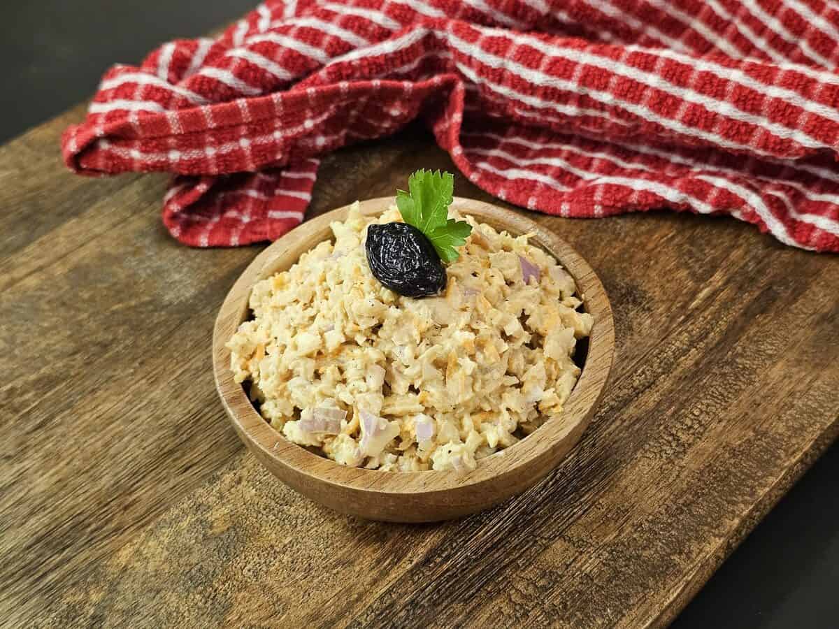 מוסיפים שמן זית, בצל קצוץ, גזר מגורר, מיונז, מיץ לימון, חומץ תפוחים ופלפל שחור.