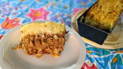להדק מעליה את הפירה. לזלף שמן זית מעל הפירה ולאפות 180 מעלות ארבעים דקות.