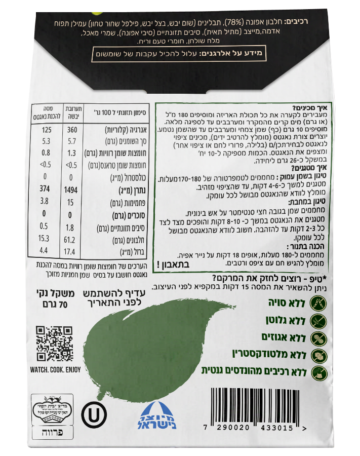 - ללא גלוטן: פורמולה על בסיס צמחי וללא עוף מאפשרת לאנשים עם רגישויות לגלוטן ליהנות מהמנה.