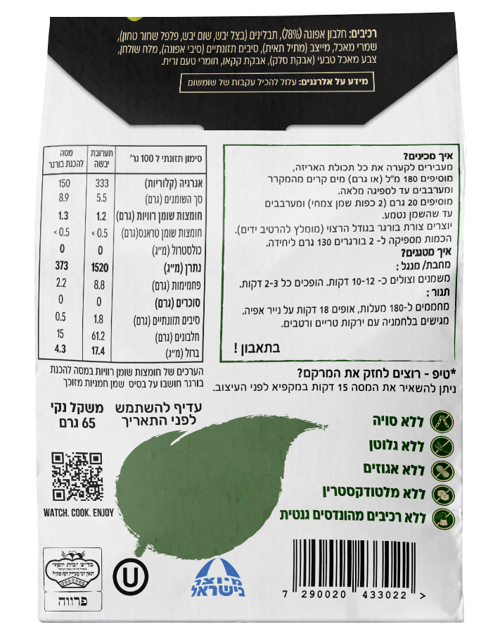 - נוח לתכנון שבועי: 4 חבילות התערובת מספקות 8 קציצות ו-160 גרם חלבון, מה שמספיק לשבוע.