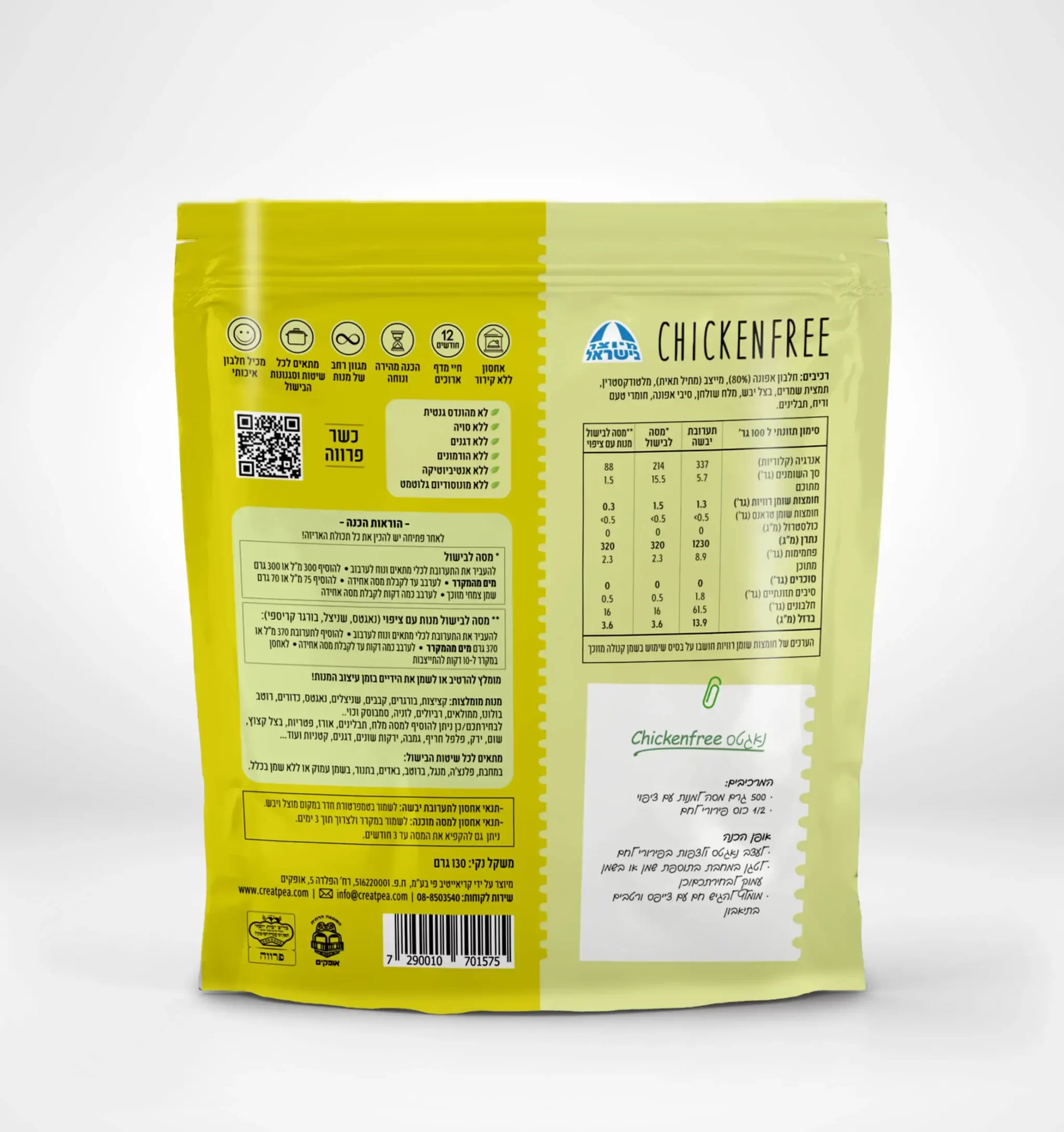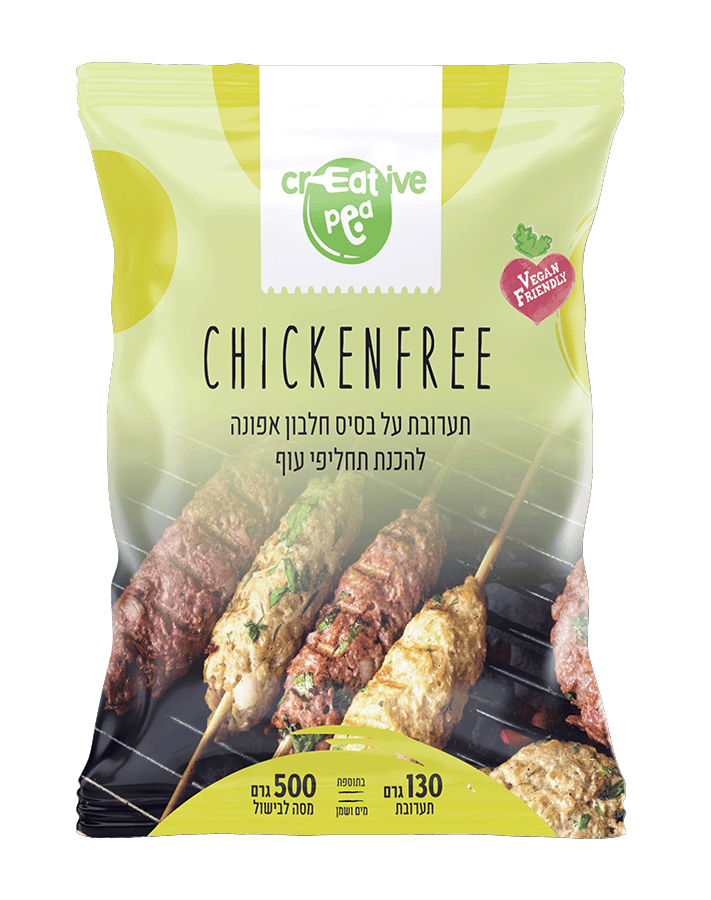 תערובת תחליף העוף הייחודית של CHICKENFREE על בסיס חלבון אפונה הינה תערובת חזקה בטעמיה, ומתאימה עצמה למנות “עוף” מגוונות כגון: קציצות עוף, קבבוני עוף, צ’יקן נאגטס, שניצל, קבבים, ממולאים, רביולי ועוד.