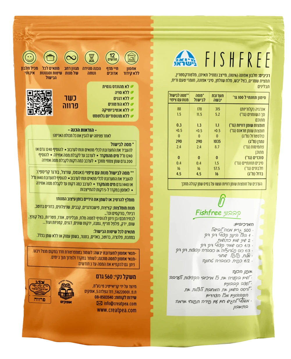 תערובת תחליף הדג הייחודית שלנו FISHFREE על בסיס חלבון אפונה הינה תערובת חזקה בטעמיה, ומתאימה עצמה למנות “דג” מגוונות כגון: קציצות “דג”, קבבוני “דג”, פילה “דג”, שניצל “דג” ועוד.